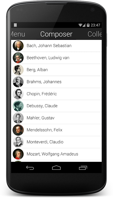 Compositori in vetrina: Adam, Albéniz, J.S. Bach, C.P.E. Bach, Beethoven, Berg, Berlioz, Bizet, Boccherini, Boëllmann, Borodin, Brahms, Bruch, Bruckner, Chausson, Chopin, Corelli, Debussy, Donizetti, Dukas, Dvořák, Elgar, Fauré, Franck, Granados, Grieg, Halvorsen, Handel, Haydn, Holst, Janáček, Joplin, Liszt, Mahler, Massenet, Mendelssohn, Monteverdi, Moszkowski, Mozart, Mussorgsky, Paganini, Pergolesi, Purcell, Rachmaninoff, Ravel, Respighi, Rheinberger, Rossini, Saint-Saëns, Sarasate, Satie, Schubert, Schumann, Scriabin, Smetana, Sor, Strauss Jr., Strauss Sr., Tarrega, Tartini, Tchaikovsky, Telemann, Verdi, Vivaldi, Wagner, Waldteufel, Weber, con più in corso