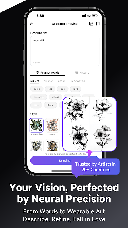 Puoi caricare la bozza del tuo disegno del tatuaggio per la modifica e la stampa.