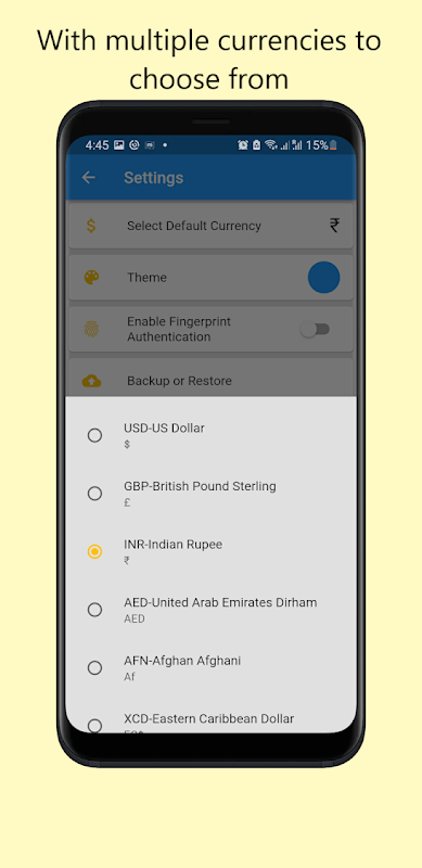 In cui hai una varietà di opzioni per personalizzare la tua valuta (tutte le valute disponibili nell'app) e anche cambiare i temi dell'app in base alla tua scelta di colore con una funzionalità di sicurezza avanzata in cui puoi impostare lo sblocco delle impronte digitali per l'app.