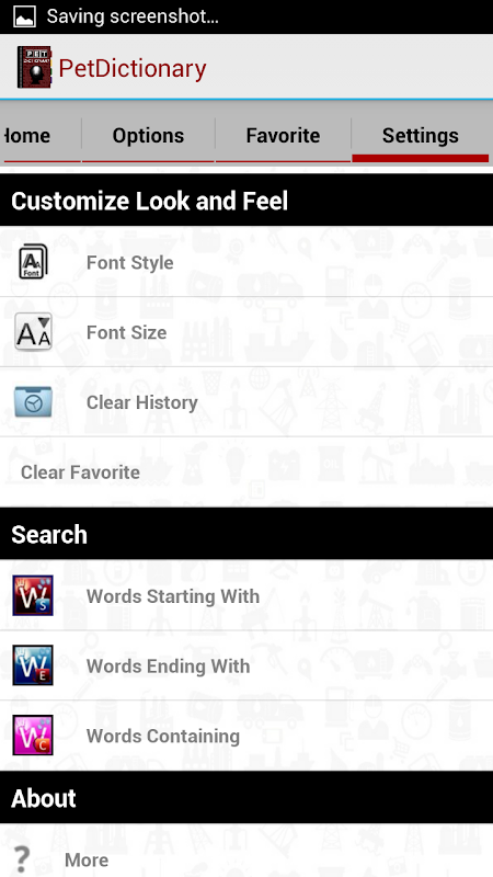 1. Dynamic Search: Users can choose from the available search features. The search can be done "with words ending", "words beginning with" or "words ending with", making it easier to locate words whose parts may have been forgotten.