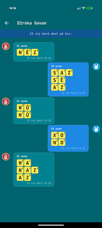 Scrabble curdo. Puoi giocare contro persone a caso o aggiungere amici e giocare contro di loro.