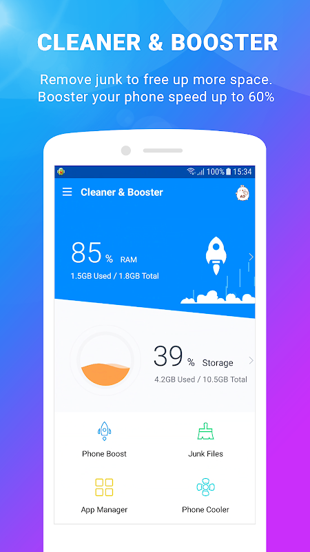 Funzioni di Cleaner & Booster: raffreddamento del telefono, gestione delle applicazioni o accelerazione del telefono, gestione della memoria intelligente integrata. Pulitore e ripetitore per Android, acceleratore telefonico accelerato e più pulito. Lo spazio di archiviazione esaurito, quindi la pulizia dello spazio di archiviazione gratuito sul telefono.