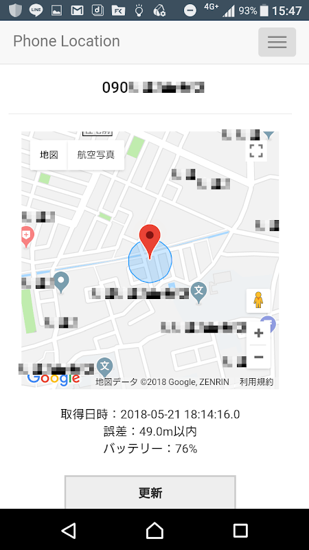 アプリをインストールし、更新間隔等を設定したら、他の端末からブラウザを使用してアプリをインストールした端末の位置を検索します。