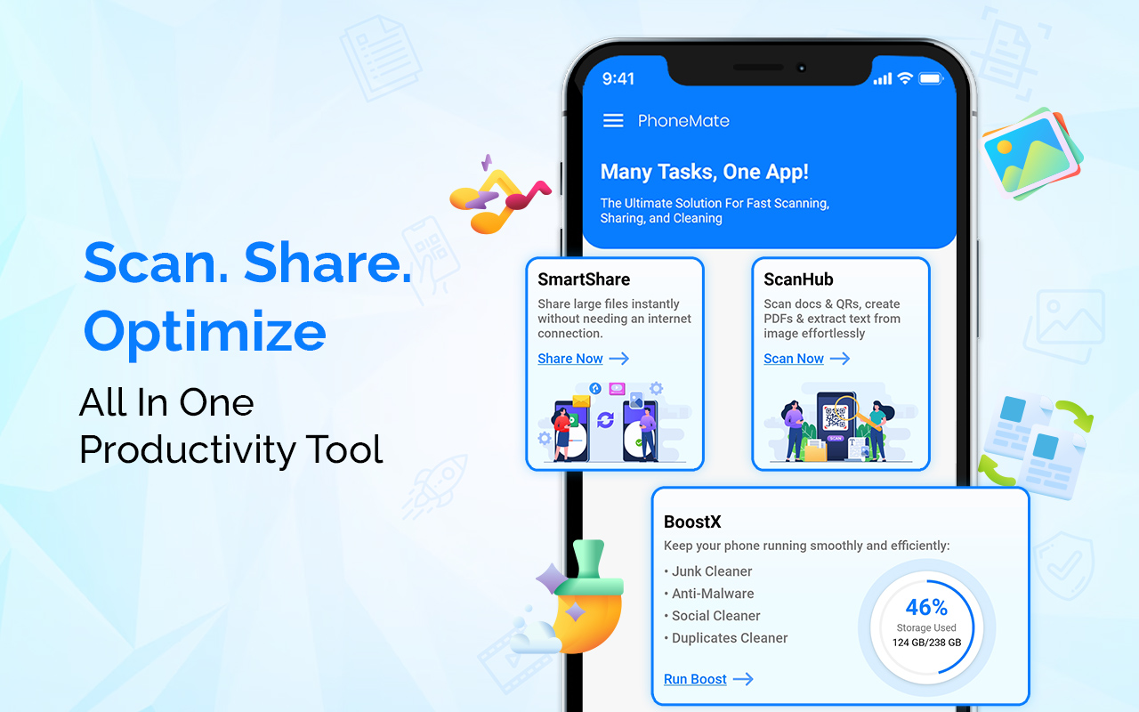 • Soluzione tutto in uno: Phonemate combina condivisione di file, scansione di documenti e ottimizzazione del dispositivo in un'unica e pratica applicazione.