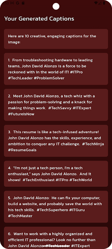 Carica la tua foto e ottieni immediatamente didascalie uniche e gratuite per la tua immagine.