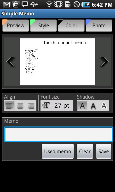 'Simple memo' app is a Widget application which is similar to Post-it to write message on and put it onto Homescreen. 'Simple memo' 's strong point is that changing option and putting message is very easy.