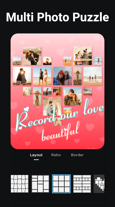 Trasforma la tua galleria fotografica in collage in pochi tocchi. Che si tratti di un semplice layout di due foto o di una complessa griglia di 20 foto, Foto Grid offre il layout di collage fotografico perfetto per ogni esigenza.