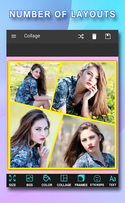 Questo editor di collage di foto ti consente di creare collage di foto utilizzando foto, immagini, adesivi divertenti, sfondi, sovrapposizioni e testo colorato. Ti aiuta a raggruppare o combinare più foto in una cornice con vari effetti e stili di cornice. Questo editor di foto è ricco di raccolte di cornici, modelli, griglie e adesivi che creano istantaneamente un collage fotografico professionale. È una grande collezione di cornici e forme.