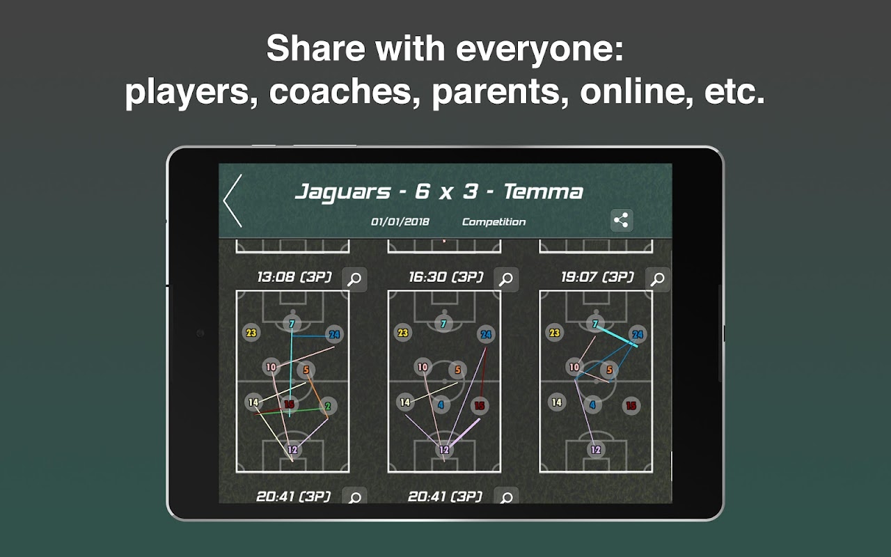 Tutti i contenuti creati su Picco possono essere condivisi come PDF, Immagini o progetto interno Picco. Condividi quello che è successo durante una partita con giocatori, genitori, staff tecnico, followers del tuo social o del tuo sito web, ecc.
