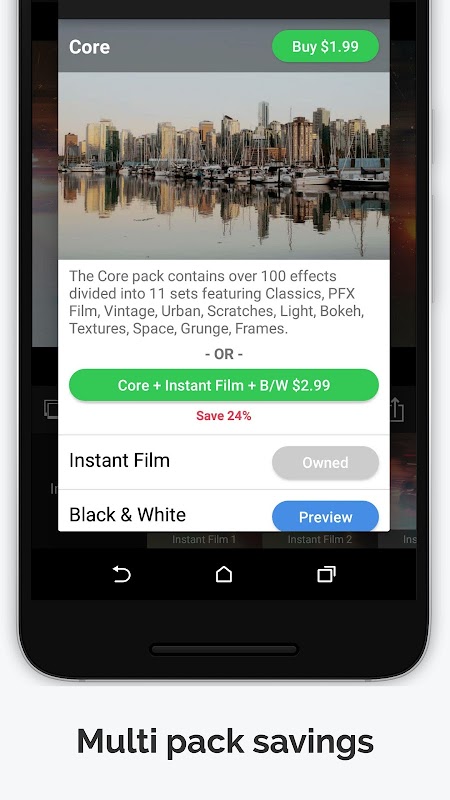 La confezione base contiene più di 100 effetti divisi in 11 gruppi caratterizzati Classics, PFX Film, Vintage, Urban, graffi, luce, bokeh, Textures, Spazio, grunge, cornici. La confezione base contiene effetti precedentemente presenti solo su iOS e molti nuovi effetti attualmente in esclusiva per Android.