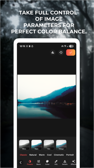 • Regolazione precisa di esposizione, contrasto, HSL (tonalità, saturazione, luminanza).