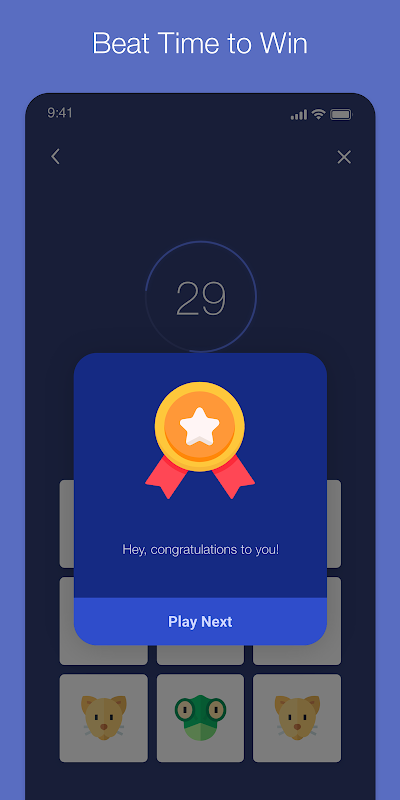 Inizialmente le carte 3 * 3 verranno mostrate in questa app di giochi di abbinamento per adulti. Se vinci il livello di queste immagini dei giochi del cervello che ti verranno mostrate, dovrai giocare al gioco di carte corrispondenti 4 * 4 del turno successivo, quindi il livello difficile sarebbe un gioco di carte con abbinamento immagini 5 * 5.