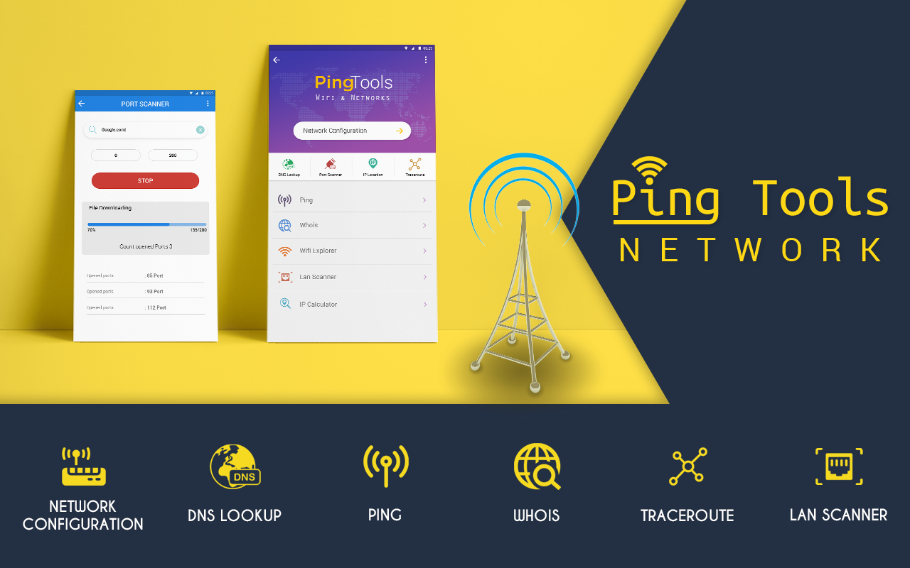Con numerosi strumenti di rete gratuiti tra cui; Scanner Wi-Fi, port scanner, ricerca DNS, monitoraggio ping e servizi: questo Ping Test o Strumenti Ping e Utilità di rete è una delle migliori Utility di rete.