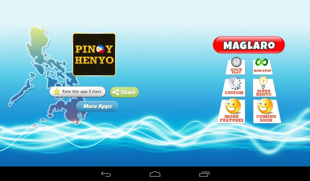 Pinoy Henyo è un puzzle game in cui ti fa indovinare una parola e puoi rispondere solo con 3 scelte. "OO" (Sì), "Hindi" (No) e "Pwede" (Forse). È stato reso popolare dal programma televisivo di mezzogiorno Eat Bulaga. Questi giochi di società sono anche conosciuti come sciarade o un gioco di indovinare le parole del partito.