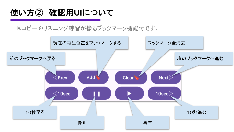 Dispone inoltre di una funzione per contrassegnare il punto di riproduzione, rendendola ideale per la riproduzione a orecchio e per esercitarsi nell'ascolto in inglese.