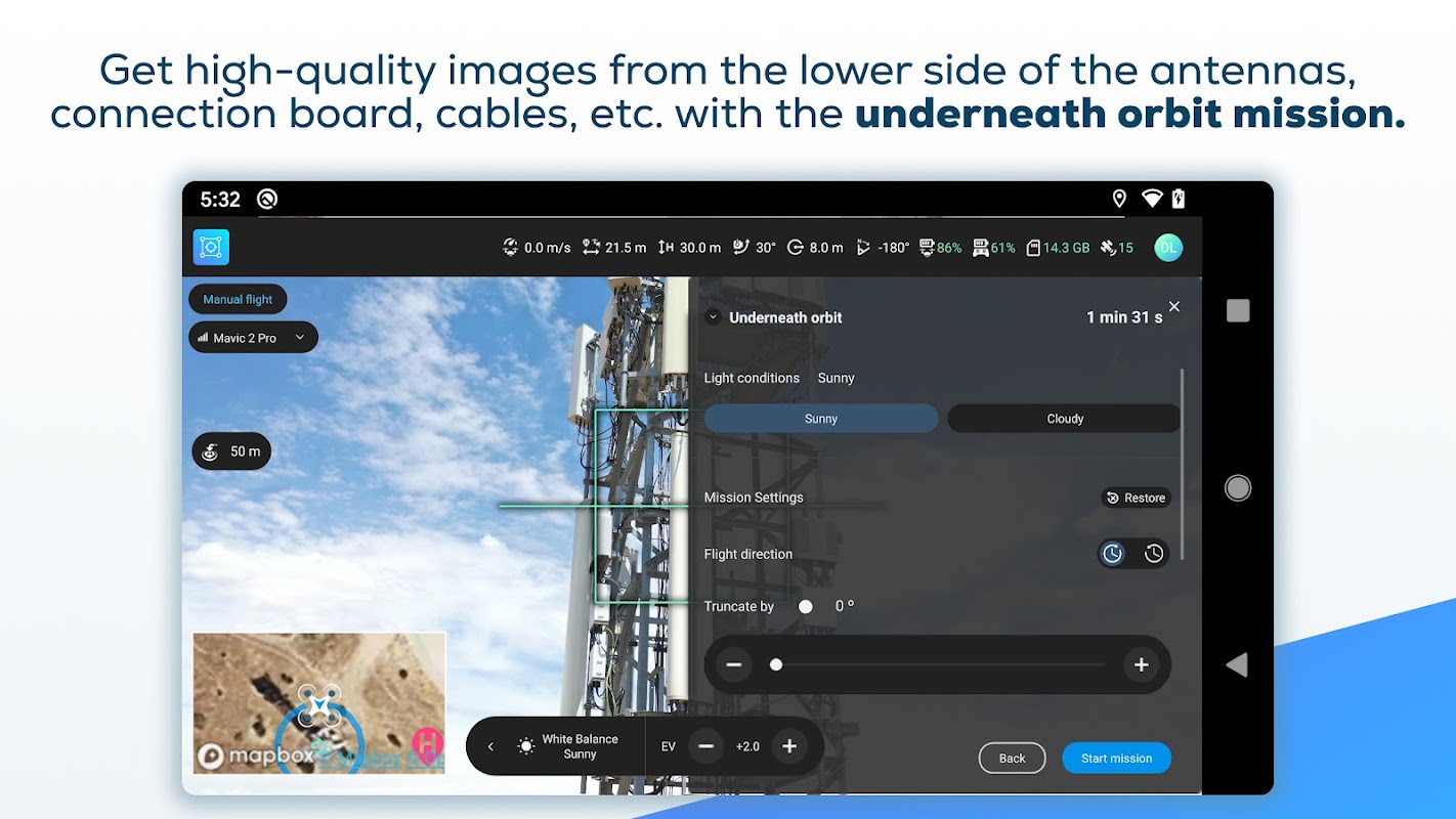 2- Inizia e vola - Tieni traccia dei progressi della tua missione con la visualizzazione della mappa o monitora dal vivo con la visualizzazione della telecamera. PIX4Dscan fornisce dati di telemetria in tempo reale come altitudine, velocità, angolo della telecamera e altro ancora.