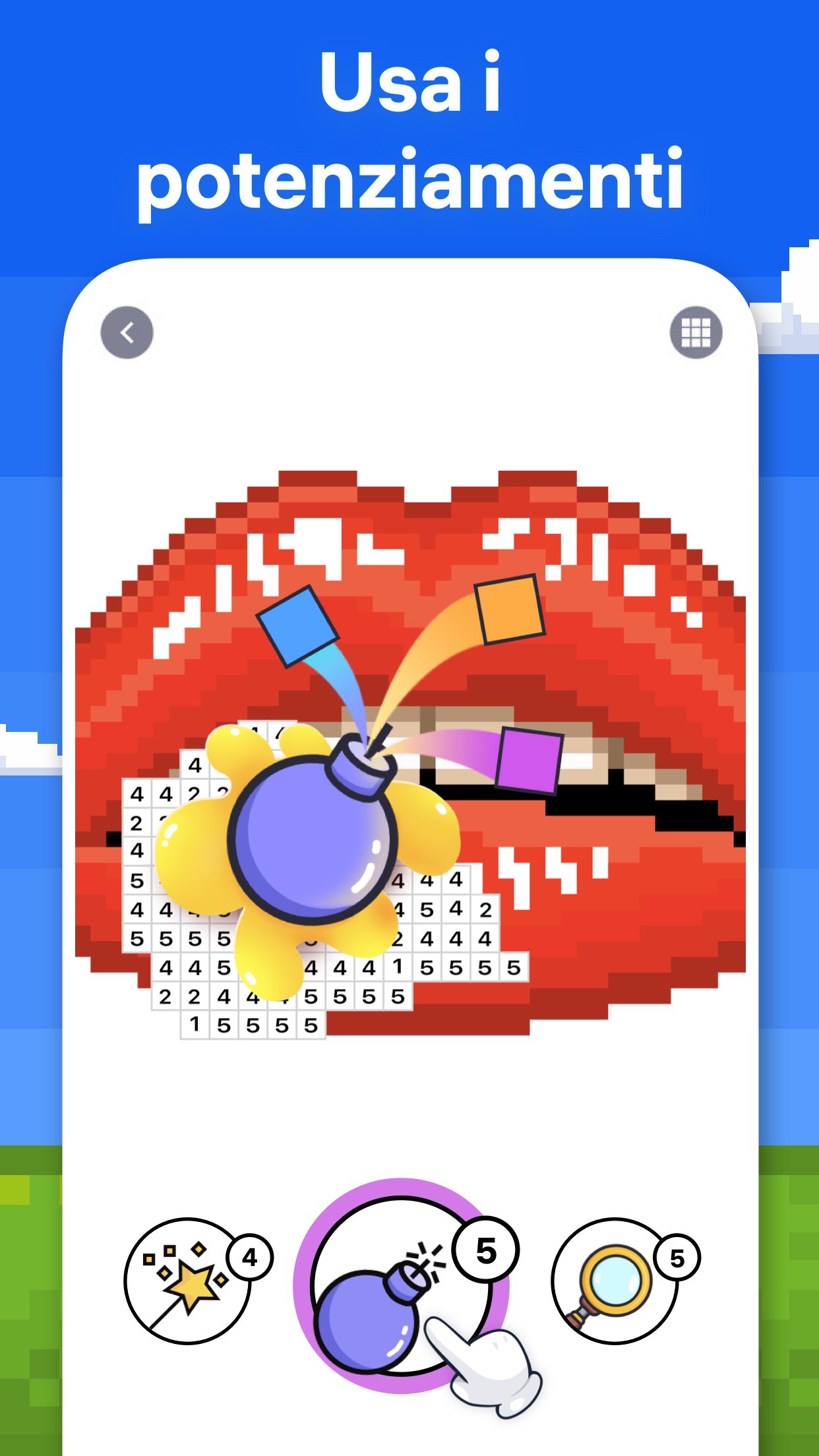 ✅ Usa i booster per completare più rapidamente le immagini più dettagliate. Scegli Spruzzo di colore per colorare rapidamente delle aree, oppure Bacchetta magica per riempire con lo stesso colore una serie di caselle con lo stesso numero.