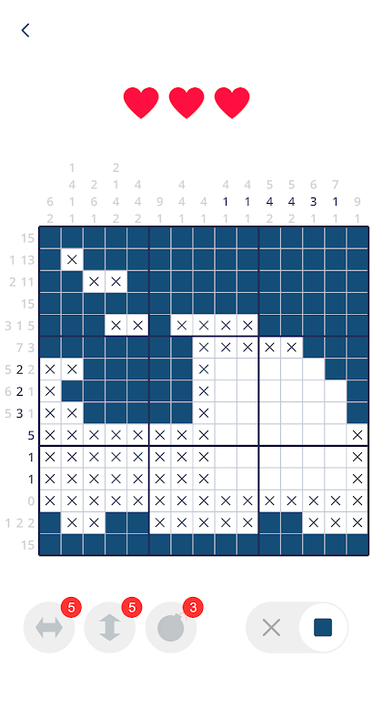 · Segui gli indizi con i numeri per capire quali celle devono essere colorate o lasciate vuote per risolvere i nonogrammi.