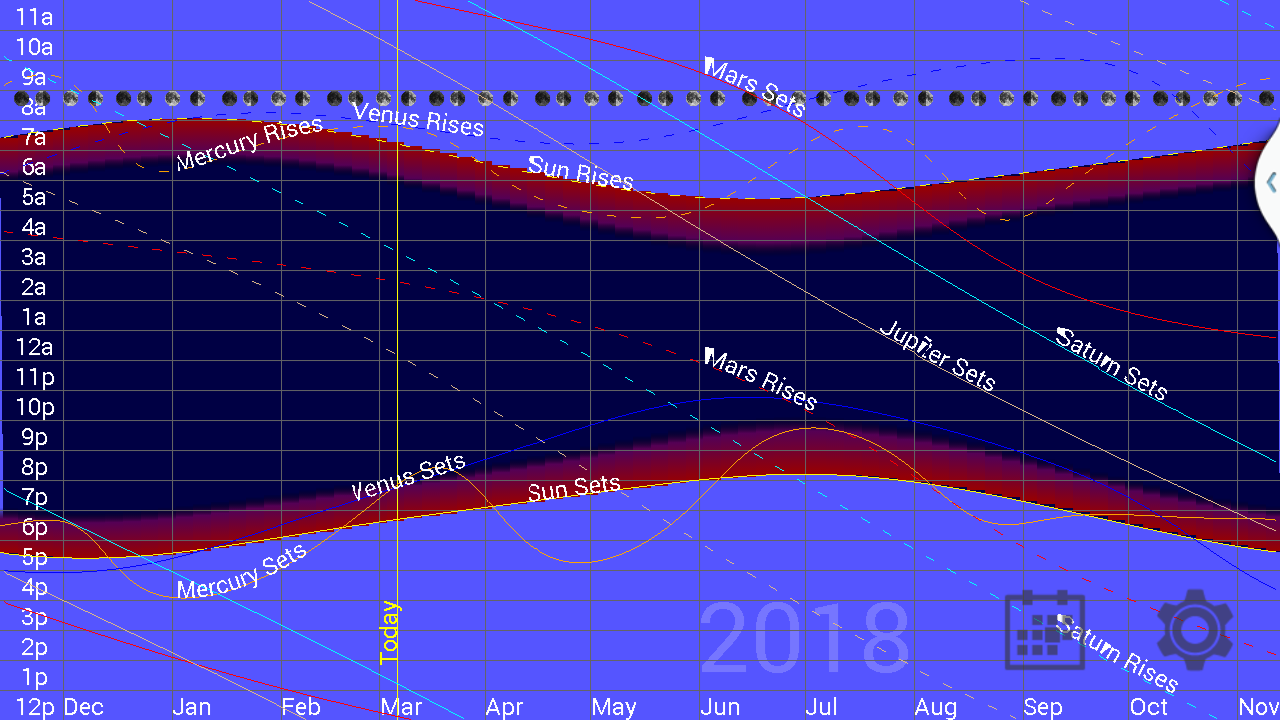 Utile per determinare quando un pianeta sarà visibile. Questa applicazione mostra un grafico della levata e tramonto per tutti i pianeti dal 2000 al 2050. Essa mostra anche alba, tramonto, crepuscolo volte astronomici, e fasi lunari. I pianeti visibili ad occhio nudo sono stabilizzati allo su (Mercurio, Venere, Marte, Giove, Saturno), ma Urano, Nettuno e Plutone sono disponibili nelle opzioni. L'applicazione utilizza l'unità di dispositivi GPS per mostrare aumento e orari prestabiliti per la particolare posizione. Si noti che tutti i tempi sono ora legale, quindi sarà necessario aggiungere o sottrarre un'ora per tenere conto di ora legale quando è in uso.