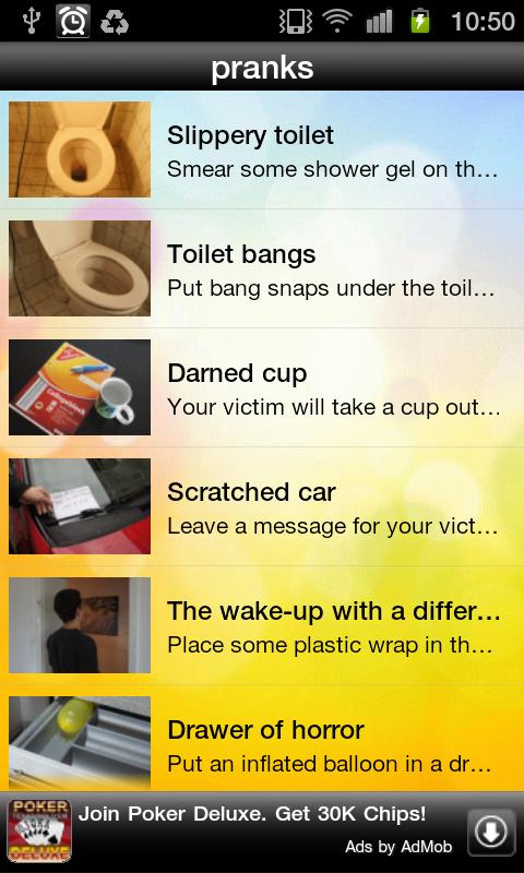 Vuoi provare un paio di scherzi nuovi e creativi che non conoscevi fin'ora? La nostra app di scherzi ti offra un'ampia scelta di diversi scherzetti per avere sempre qualcosa da ridere.
