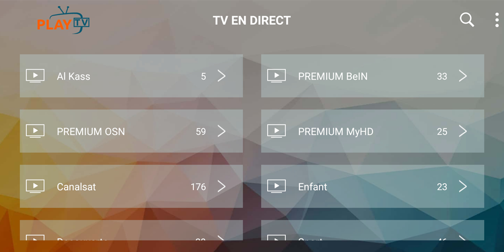 PLAY TV offre tutti i canali francesi (Canalsat, canal +), belga, svizzero, italiano (Sky it), tedesco (Sky De) e arabo. L'elenco dei bouquet continua a crescere, con ogni aggiunta, troverai i nuovi canali direttamente nelle tue applicazioni PLAY TV del dispositivo, senza alcun intervento necessario da parte tua.
