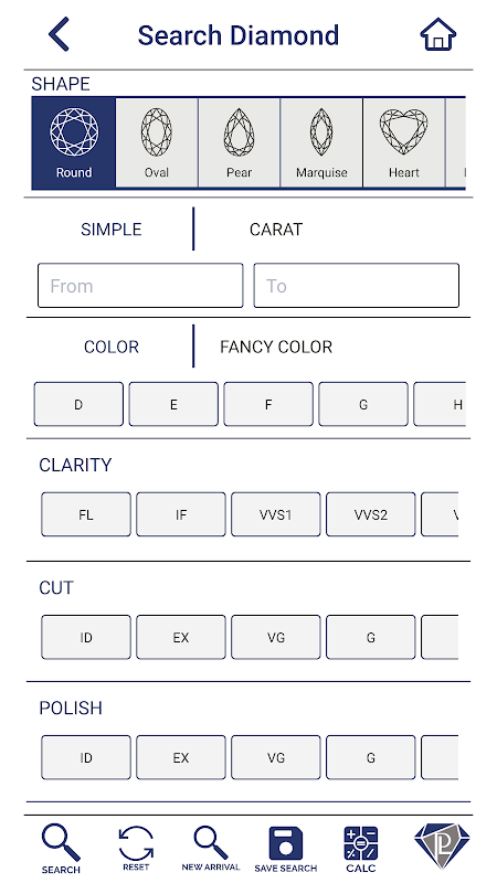 • Dall'opzione Cerca puoi scegliere i diamanti secondo il tuo attributo di preferenza.