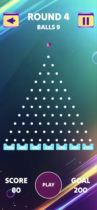Questo gioco ti sfida a raggiungere l'obiettivo del punteggio facendo cadere le palline su una tavola triangolare. Ogni pallina rimbalza in modo imprevedibile attraverso i picchetti e atterra nelle fessure del moltiplicatore nella parte inferiore. Il tuo punteggio totale dipende da dove cadono le palline: x20, x30, x50 o anche x100. C'è un numero limitato di palline per round e un obiettivo che devi raggiungere per avanzare. Il tempismo e un po’ di fortuna determineranno il tuo successo. Con ogni livello, l'obiettivo aumenta, richiedendo decisioni più intelligenti su quando e dove rilasciare la palla. Guarda attentamente, premi "Gioca" e vedi se la tua pallina si ferma nella zona del moltiplicatore più alto.