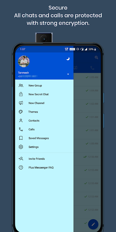 SECURE: We made it our mission to provide the best security combined with ease of use. Everything on Plus Messenger, including chats, groups, media, etc. is encrypted using a combination of 256-bit symmetric AES encryption, 2048-bit RSA encryption, and Diffie–Hellman secure key exchange.