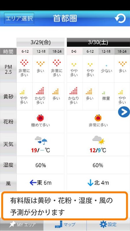 Nella versione a pagamento, puoi controllare contemporaneamente le previsioni di sabbia gialla e polline e le previsioni del tempo.