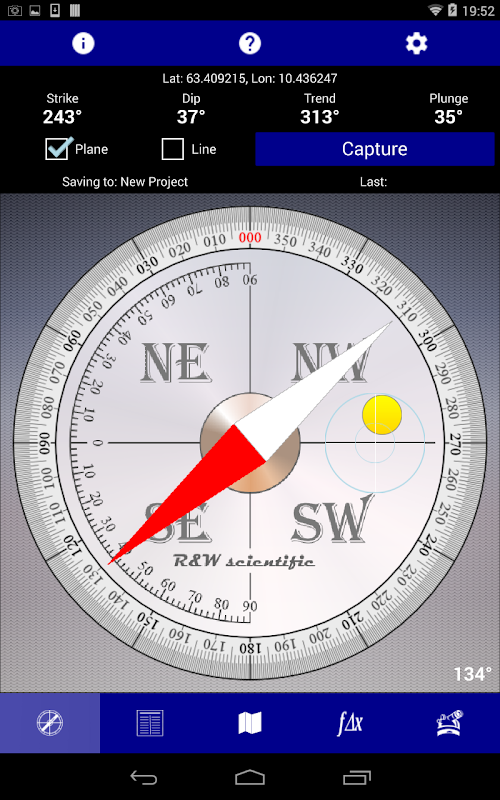 pagina Bussola: visualizza la bussola azimutale, insieme a sciopero, tuffo, tendenza, tuffo, e la posizione (in latitudine / longitudine o UTM), e include un display inclinometro.