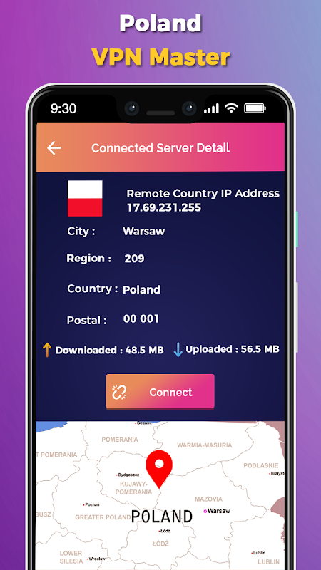browsing with Poland VPN Master is the fastest network of any Poland country. Find all latest information like news, videos and many more sites related to Poland country. An application can particularly design considering the Intuitive User Interface while using it. your device and network are safe to use while you using or connected with any servers.