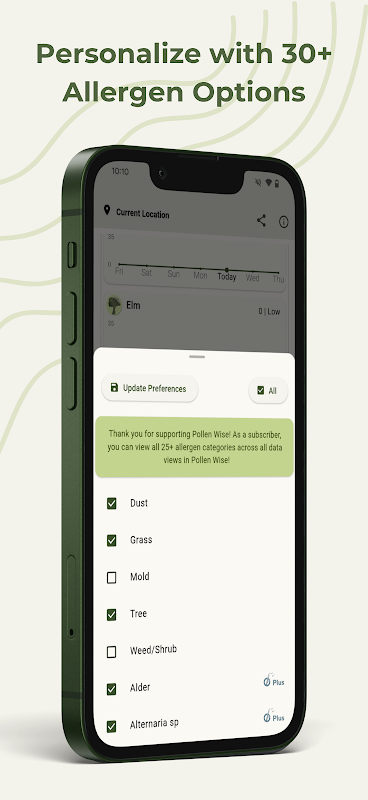 Molte funzionalità di Pollen Wise sono gratuite, mentre altre richiedono un abbonamento (Pollen Wise Plus). Ottieni l'accesso a più dati storici, un'esperienza di diario migliorata, widget per la schermata iniziale/di blocco e altro ancora con Pollen Wise Plus!