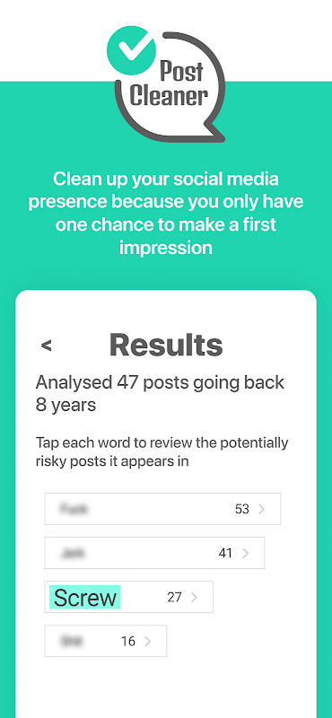 Post Cleaner privately analyzes your social media posts and identifies potentially offensive content. Profanity, vulgar phrases, and other objectionable language are identified, and then a left/right swipe function allows you to quickly sort through flagged content to dismiss or mark for editing.