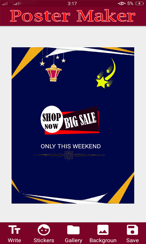 Poster Maker fornendo possibilità di creare manifesto ora poster design facilmente .Bellissimo per poster fare con grande collezione di bellissimi adesivi che è possibile utilizzare per la cartellonistica. Crea tutti i tipi di manifesto come poster promozionali per pubblicità e di altri tipi di manifesto come il compleanno, manifesto di vendita di festival, poster business e promozione dei prodotti.