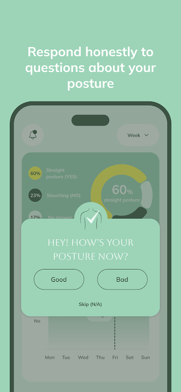 Posture Check ti chiede alcune volte al giorno di riflettere sulla tua postura. Monitorando i tuoi progressi, ti motiva a migliorare costantemente le tue abitudini di postura. Provatelo!