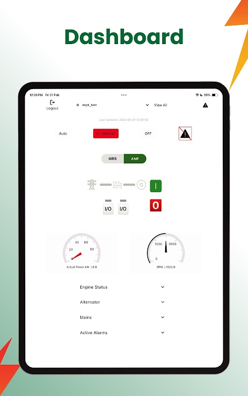 Tensioni, correnti, frequenze e fattore di potenza del generatore e della rete, oltre ad altre letture importanti come l'ultimo aggiornamento, le ore di funzionamento, la temperatura del liquido di raffreddamento, la pressione dell'olio, l'energia, ecc.