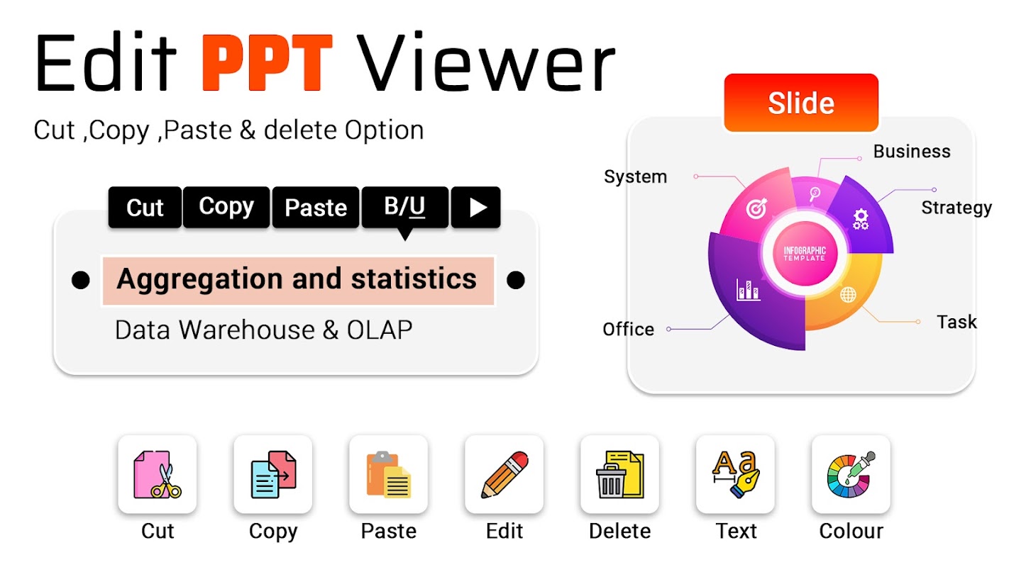 L'apri file PPT può aprire tutti i file PPT e puoi leggere tutte le presentazioni su un visualizzatore di documenti PPT. Questo è molto necessario per aprire qualsiasi file PPT sul tuo smartphone. Lettore per ufficio e lettori di documenti per lezioni scolastiche leggono facilmente la sua presentazione su un visualizzatore PPT per smartphone. C'è uno speciale visualizzatore di presentazioni per leggere qualsiasi presentazione sul visualizzatore di diapositive. PPT facile da leggere e condividere con chiunque con un solo clic. C'è un gesto con due dita per ingrandire e rimpicciolire per leggere facilmente qualsiasi file PPT.