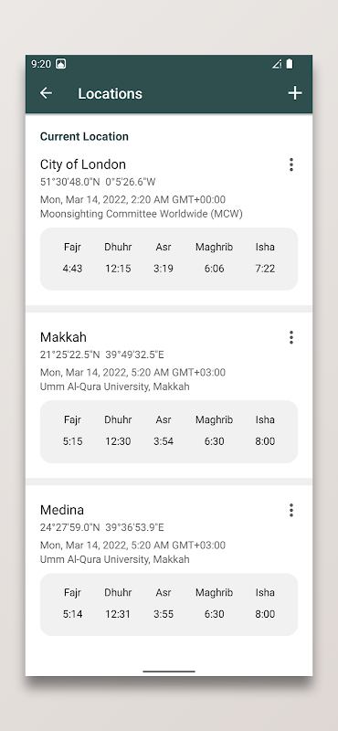 • Mostra gli orari di Fajr, Dhuhr, Asr, Maghrib, Isha e orari opzionali come Imsak, Shuruq, Duha, Midnight e Qiyam