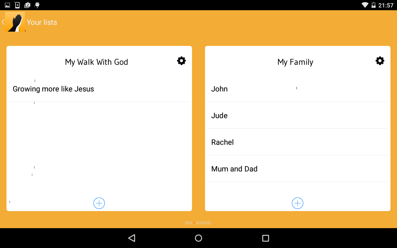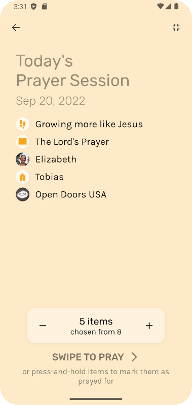 Ogni giorno, Prayer Mate selezionerà una persona o un argomento che hai inserito da ciascuna delle tue categorie principali (forse "La mia famiglia" o "Il mio piccolo gruppo in chiesa") e te li mostrerà come una serie di schede - quindi basta scorrere tra di loro per pregare.