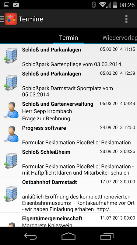 Vede rapidamente appuntamenti aperti, cronologia dei clienti, corrispondenza, offerte e fatture. Naturalmente, sono disponibili anche tutti i dettagli di contatto per effettuare comodamente chiamate telefoniche, inviare e-mail o avviare la navigazione al cliente. La documentazione della visita del cliente, la creazione di nuove persone di contatto o altre modifiche ai dati sono possibili direttamente online. Naturalmente, tutto ciò avviene in base ai diritti di accesso individuali.