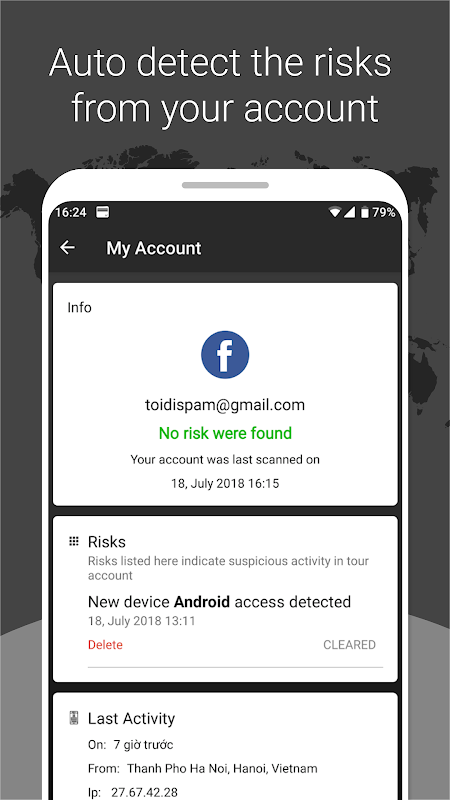 Proteggete i vostri account Facebook, Gmail, Instagram, Twitter. Rilevare e prevenire l'accesso non autorizzato a rubare i dati dal tuo account online. Monitoraggio attività di log consente di rilevare l'accesso sospettoso e offre soluzioni per proteggere il vostro account online.