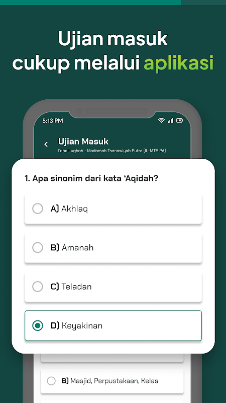 Oltre a ciò, questa applicazione fornisce anche funzionalità di esame online, dove i futuri studenti possono sostenere l'esame secondo le procedure stabilite. Questo esame online può coprire vari materiali relativi ai criteri di ammissione al collegio islamico Al-Furqon Al-Islami Gresik. I risultati dell'esame costituiranno una delle considerazioni per determinare se i futuri studenti saranno accettati o meno.
