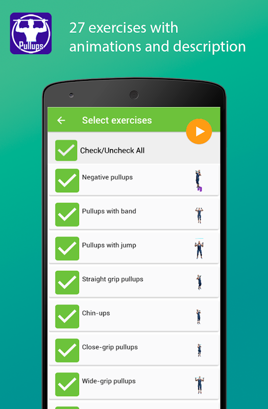 L'esercizio principale per la barra orizzontale pull-up. Classic pull-up a sviluppare la muscolatura della schiena e le mani. Ma non tutti sanno che pull-up sono di diversi tipi. Oltre alla separazione di pull-up su impugnature (overhand e subdolo, chiudere, medio, largo, differente, neutro), ci sono molti altri tipi di pull-up ed esercizi sulla barra. Ci sono 27 esercizi sulla barra presentati in questa applicazione. L'esecuzione di questo esercita porterete il vostro corpo in una forma sportiva e diversificare gli allenamenti su una barra orizzontale. Allenamento se stessi e con gli amici!