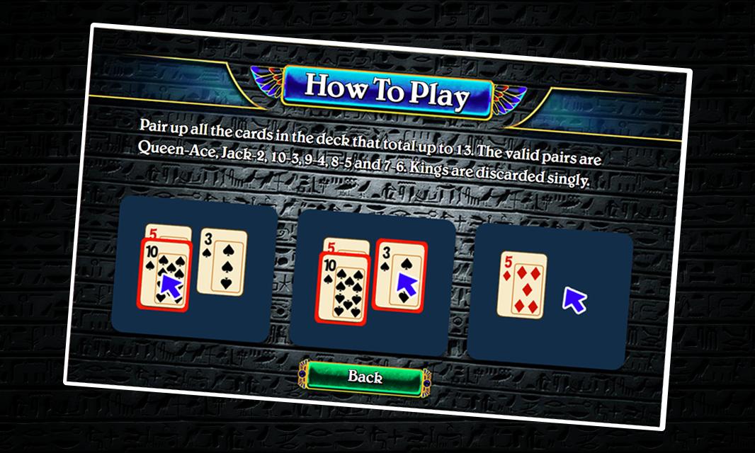 The goal of Pyramid Solitaire is to discard the entire deck by finding pairs of cards that add up to 13, regardless of suit. Kings count as 13 and are discarded singly, Queens as 12, Jacks as 11, etc.