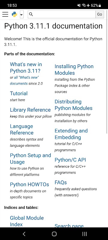 Documentazione offline HTML Python 3.11.1 per sistema operativo Google-Android. Immagina Python 3.11 la versione offline HTML completa sul tuo dispositivo mobile e disponibile per tutti.
