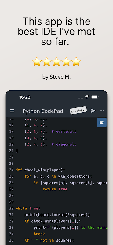 Che tu sia un principiante o un professionista, questa app ti aiuterà a migliorare le tue capacità di programmazione Python. Usa questo editor di codice per diventare un Pythonista e uno sviluppatore migliore.