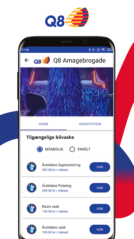 Med Q8 Bilvask appen er det nemt og hurtigt at vaske bil. Du kan både abonnere på ubegrænset bilvask eller købe en enkelt vask – direkte i appen. Som abonnementskunde får du ubegrænset bilvask, gratis støvsugning og første måned koster 0 kr. for nye kunder – herefter er prisen fra 149 kr. / md. Abonnementet er uden binding.