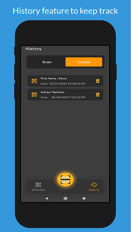 - Funzionalità di cronologia per tenere traccia dei codici QR precedentemente scansionati e generati per un facile accesso.