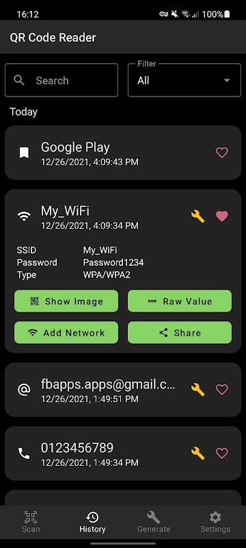 QR codes with WiFi or wifi credentials can be scanned or generated. The network can be added directly through the app.
