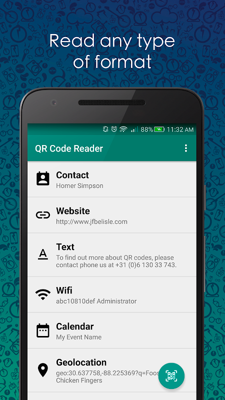 Qr Code Reader, uses the camera to scan and decode any qr and barcode format, than opens an screen with unique actions than allows you to automacally saves a contact, read a qr network and connect immediately to the WIFI without typing the password or decode a qr calendar event and save it with just pressing a button, you can also scan and read a barcode and search on the web for the best result. Scan and decode any qr and barcode format with just pressing a button to make calls, send sms, connect to a wifi network, open urls, save a contact, search for products, read text information, open a map location, add events. This and much more you can do it with Qr Code Reader.